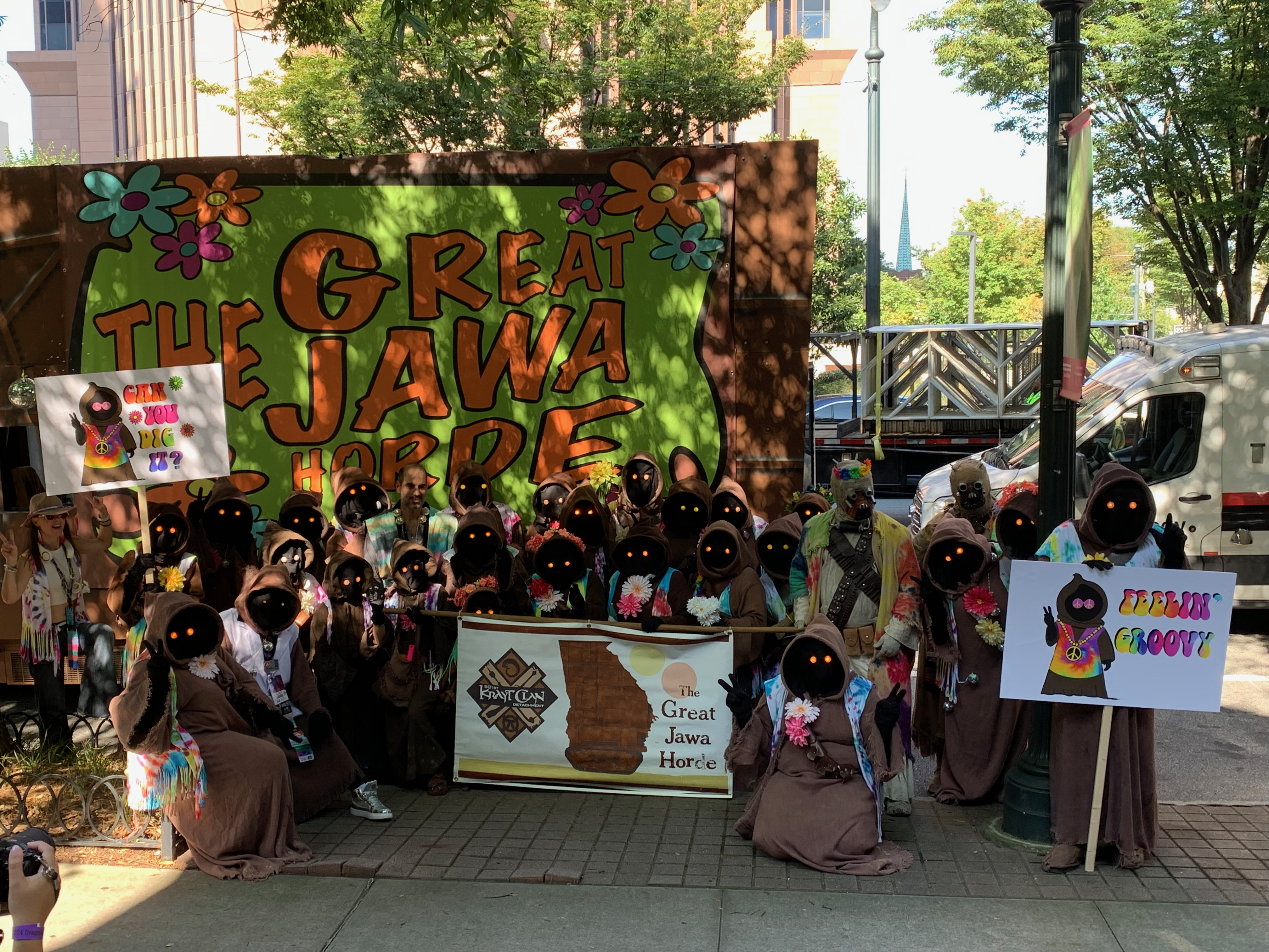 For the DragonCon 2024 parade the Great Jawa Horde took inspiration from the 60's and 70's. Our sandcrawler sported groovy side art and a disco ball while the Jawas had tie-dyed vests and lots of big flowers! If you attended the parade, you might have noticed the sandcrawler blasting some very 1970's era music that sounded kind of like the Star Wars theme, but wasn't quite right. That was Meco's "Star Wars and Other Galactic Funk", and there's an interesting story behind it on Wikipedia...
