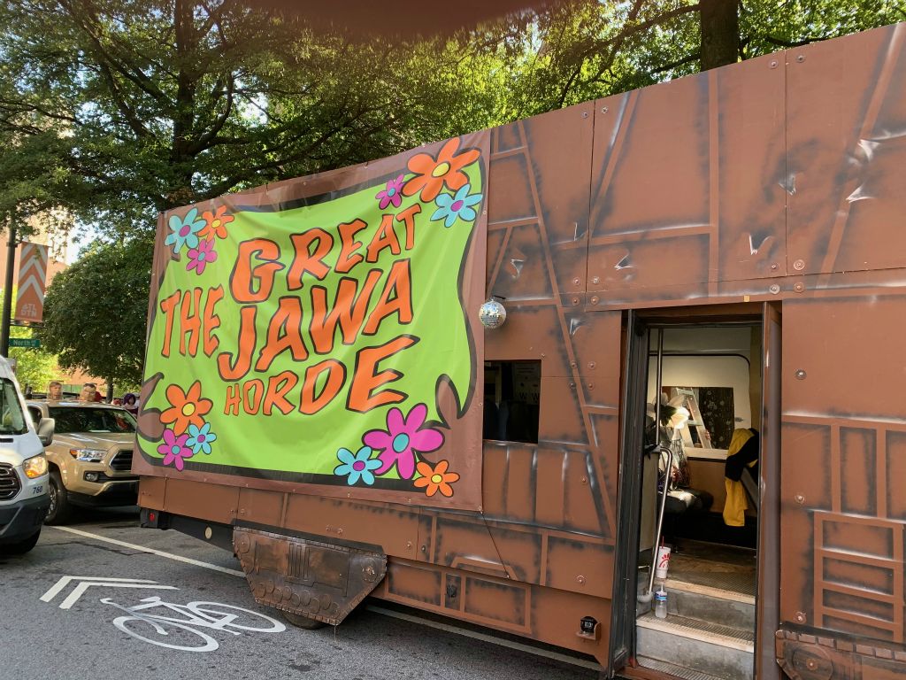 For the DragonCon 2024 parade the Great Jawa Horde took inspiration from the 60's and 70's. Our sandcrawler sported groovy side art and a disco ball while the Jawas had tie-dyed vests and lots of big flowers!