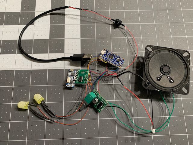 The most significant addition (and build complication) is the sound system electronics. We've settled on a solution based on the Adafruit FX mini soundboard, paired with a tiny 3 watt 5 volt amplifier and a 3 watt speaker. These are controlled by a 433Mhz 4 channel receiver and a custom "mother" board to connect the components and provide a solid mounting point. A pic of a messy prototype for this is at right.