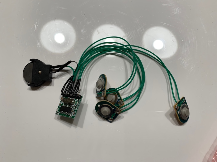 For the "control glove", we have the matching 433Mhz 4 channel transmitter and 4 tactile switches, powered by a standard cr2032 3V coin-cell battery as shown at right.