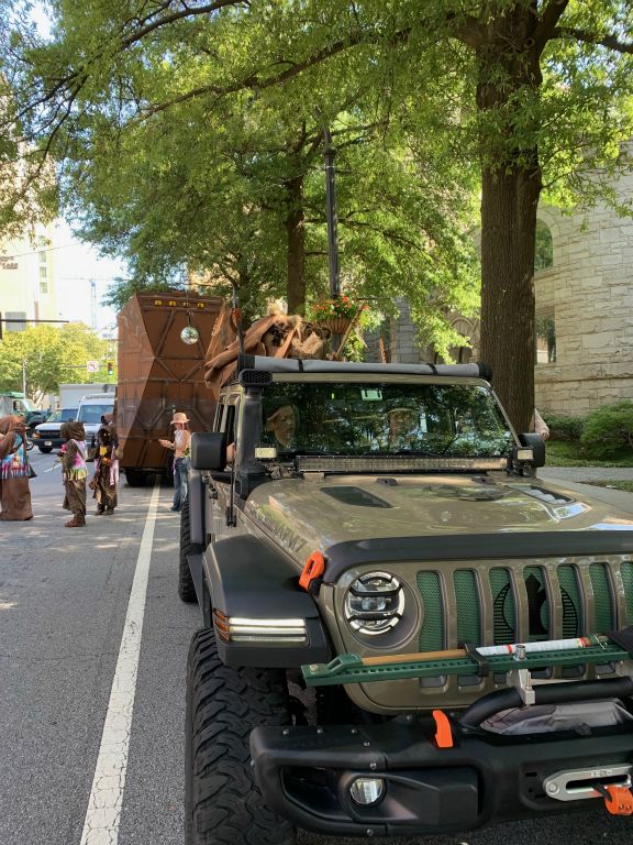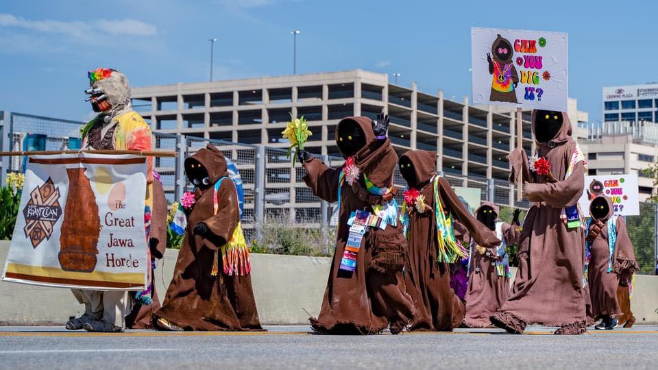 For the DragonCon 2024 parade the Great Jawa Horde took inspiration from the 60's and 70's. Our sandcrawler sported groovy side art and a disco ball while the Jawas had tie-dyed vests and lots of big flowers!